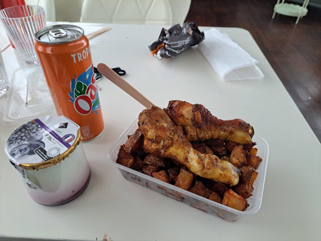 J’ai bien failli oublier de vous parler du déjeuner 🤭Ben, oui ! C’est pas top, ça ? Ouais, mais on dira que c’est moins pire qu’un fast-food, non? Tout y est : protéines, féculents, fruits et produits laitiers. Y bon kon sa (c’est bien comme c’est)🙊💃🏽