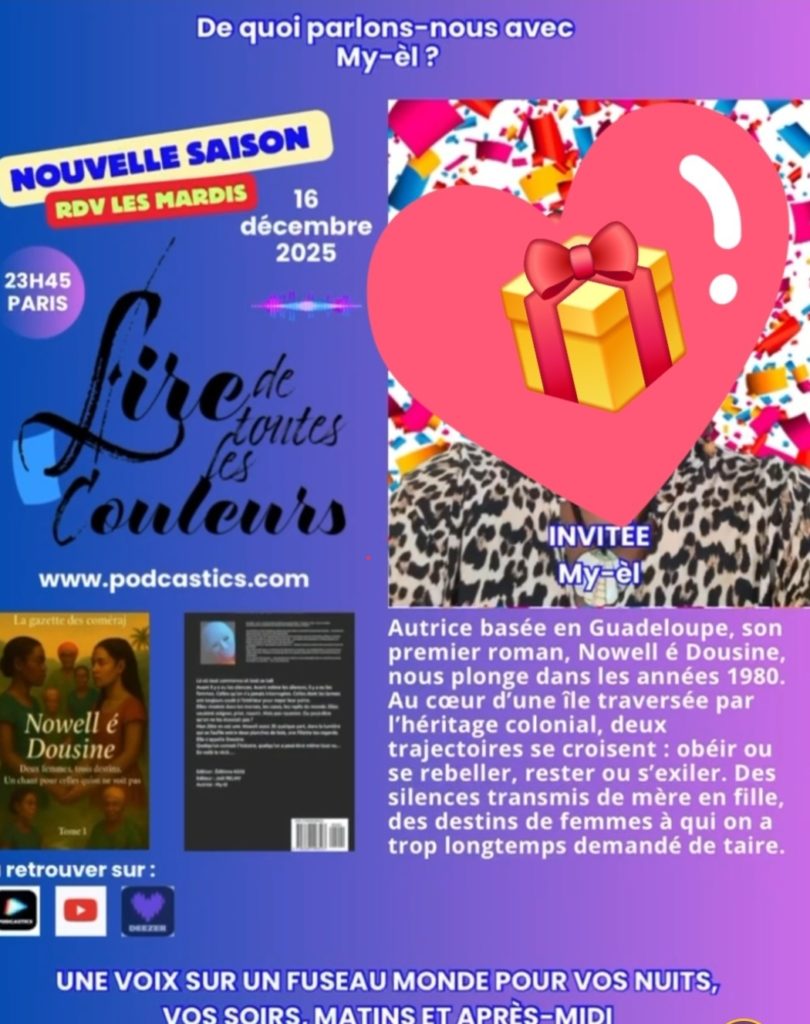 My-èl en mode podcast qu’en dit « Lire de toutes les couleurs » ? Si tu veux le savoir va sur le site. L’épisode est disponible sur toutes les plateformes en suivant ce lien : //www.podcastics.com/podcast/episode/nowell-e-dousine-de-my-el-395521/